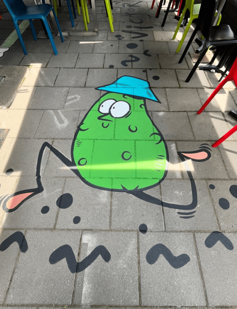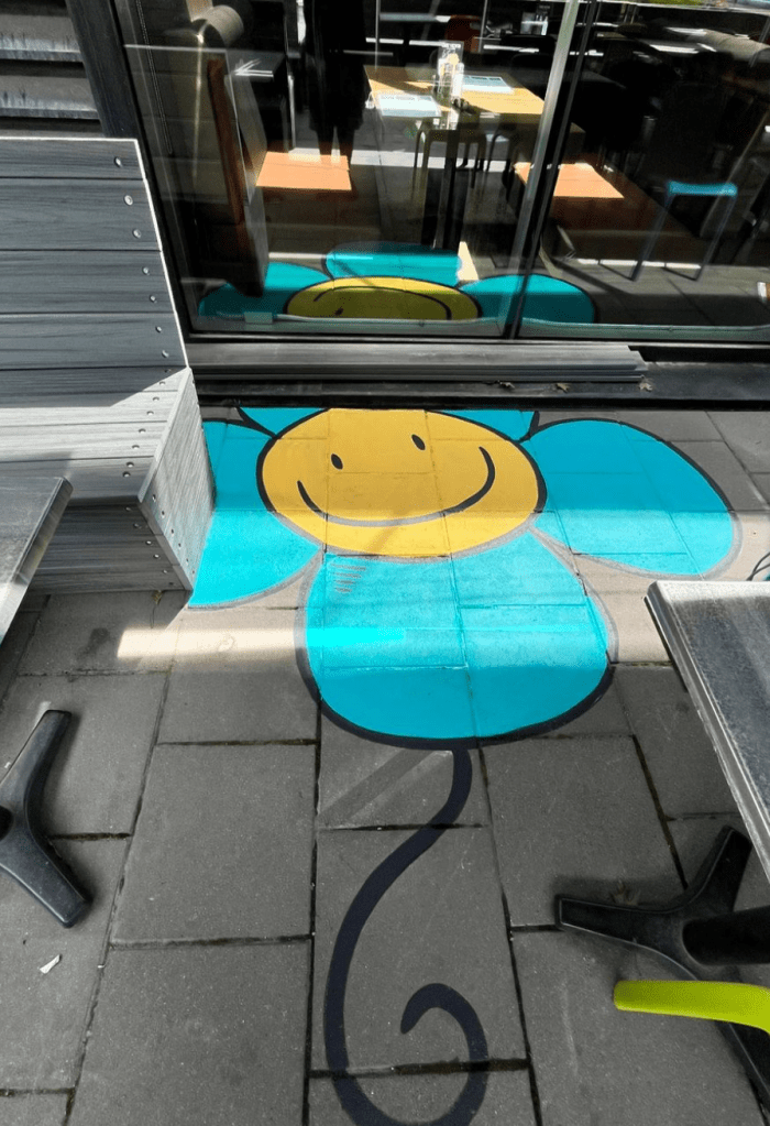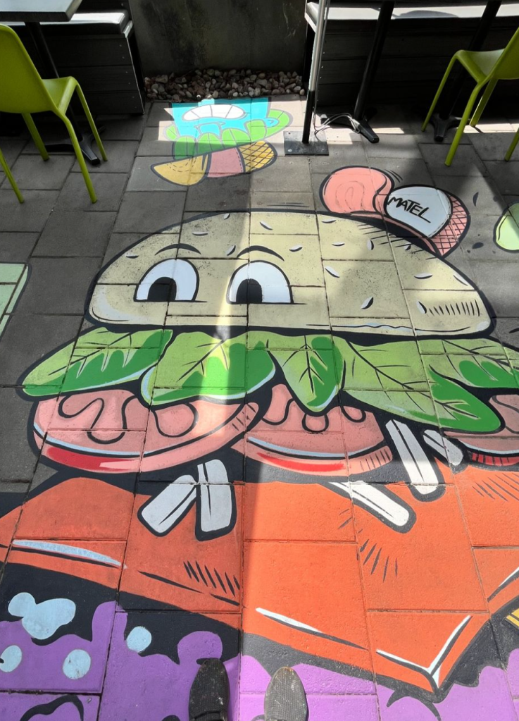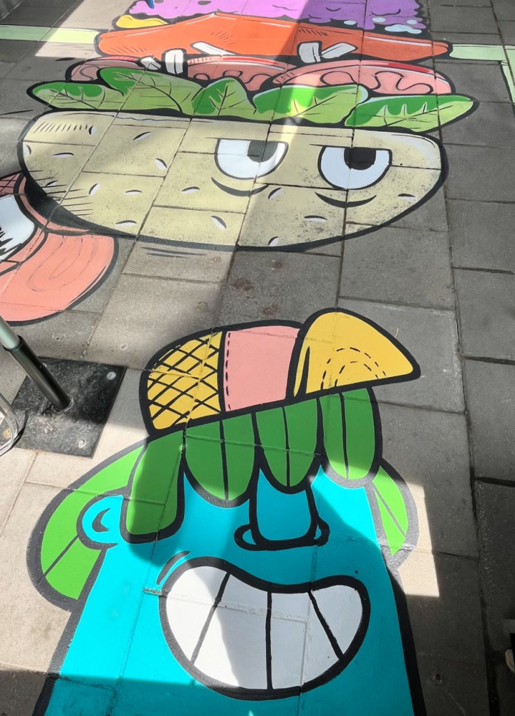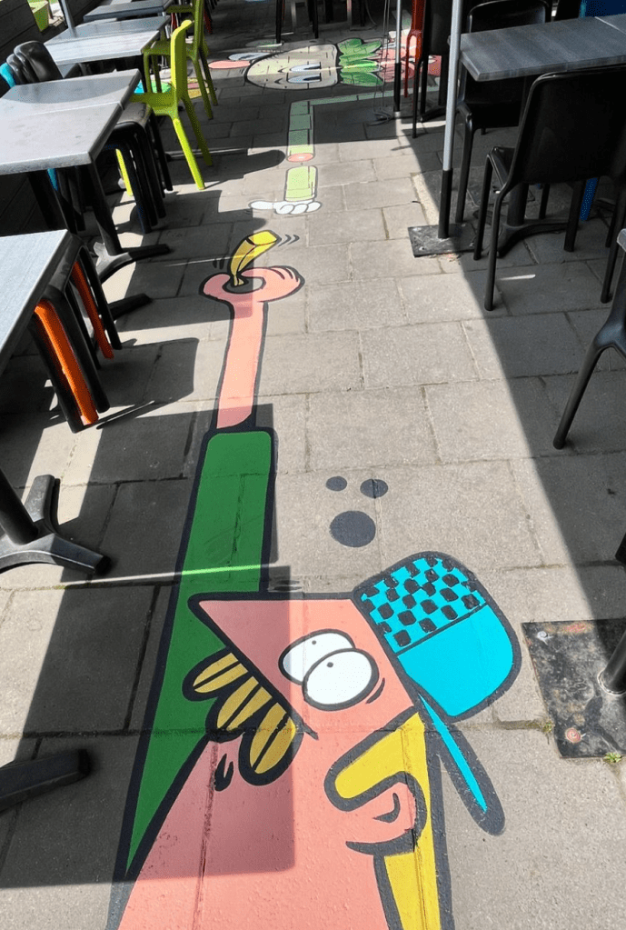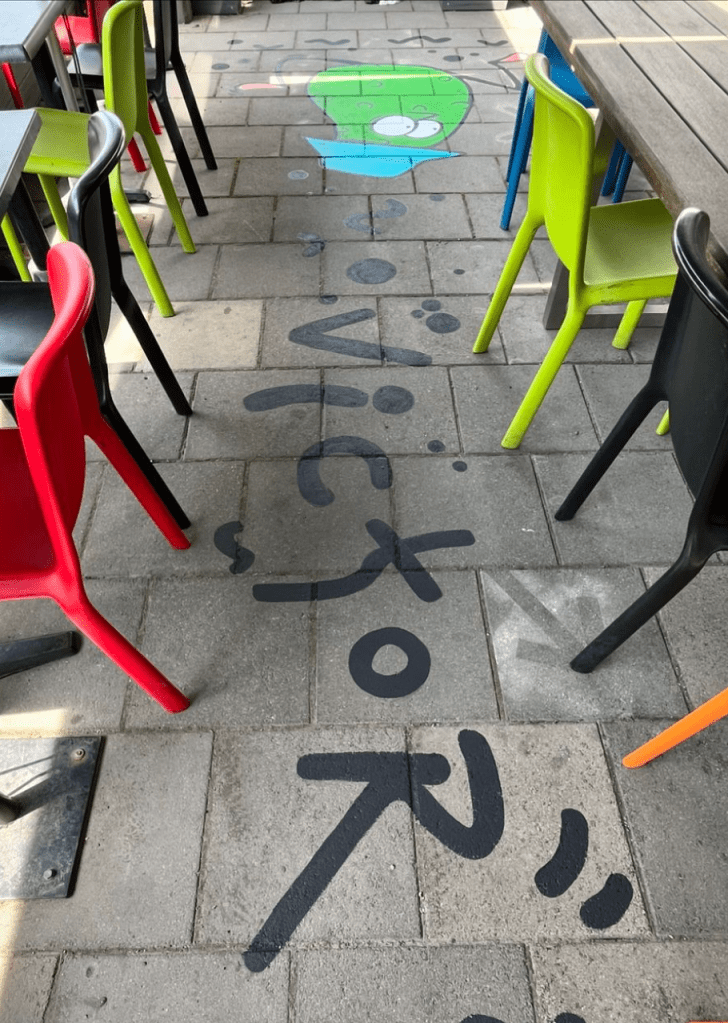 We came up with the idea to floor paint colorful characters between tables to fill the space.