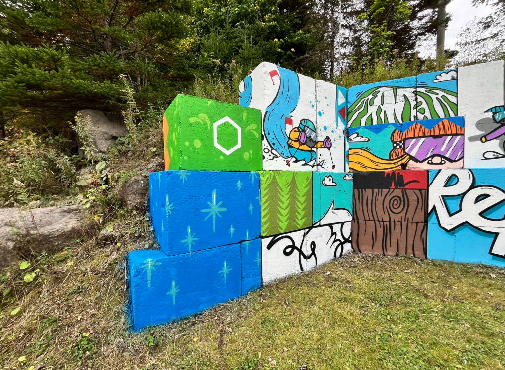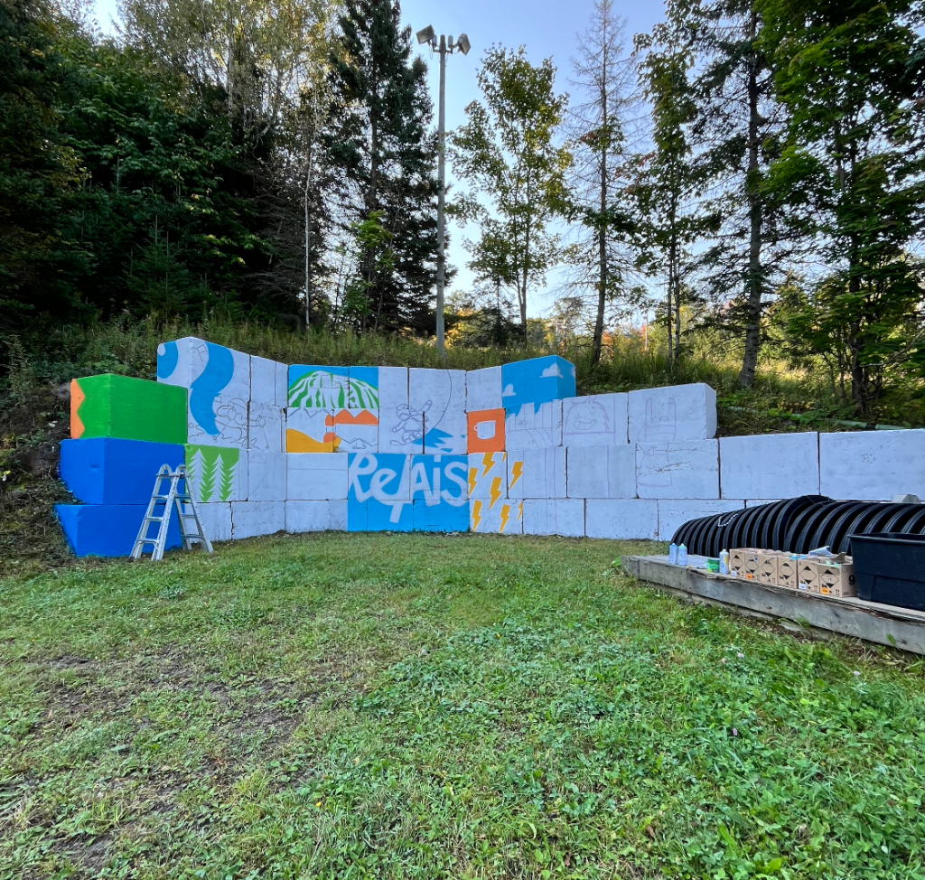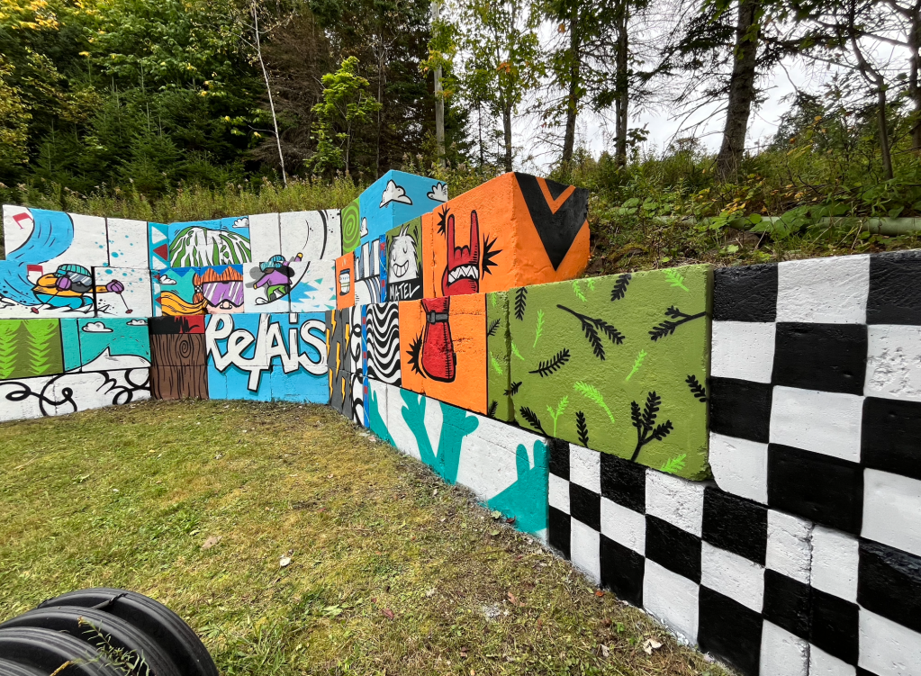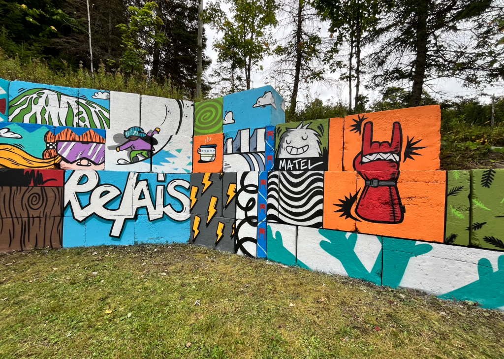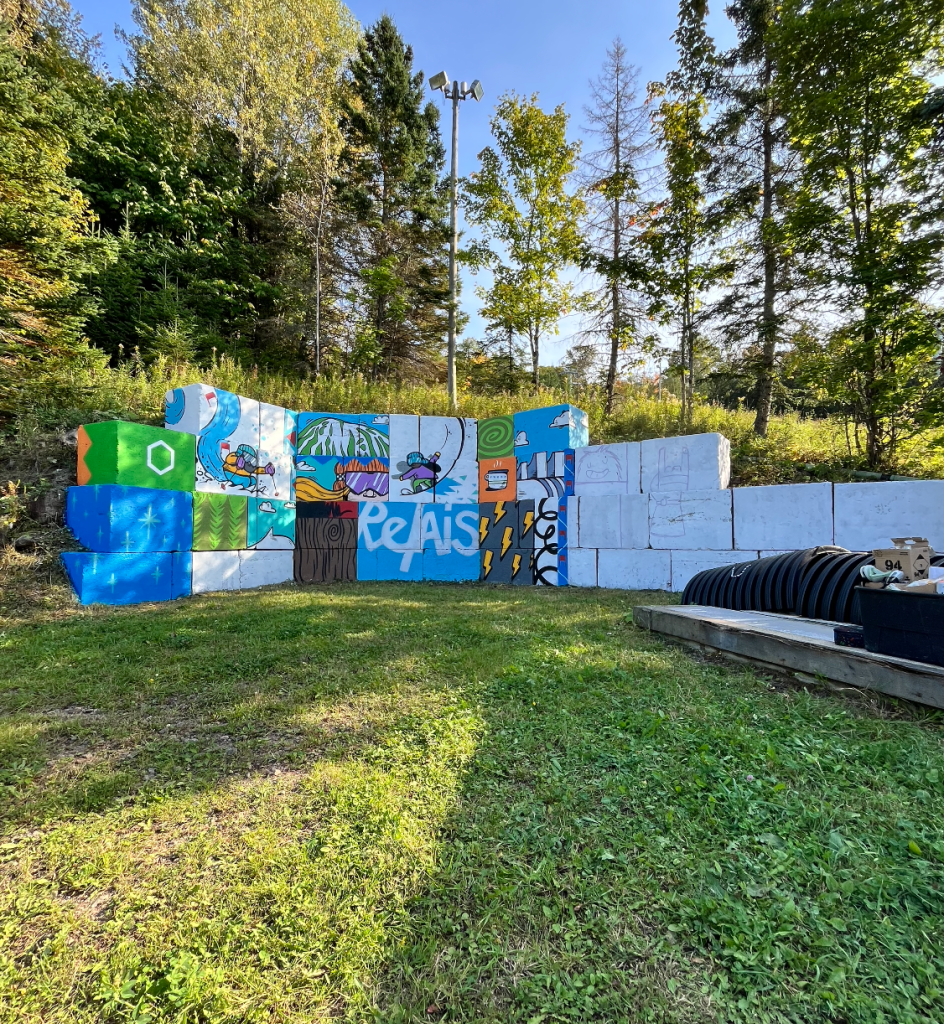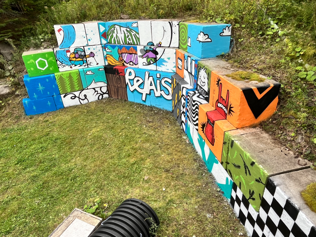 Last fall I had the pleasure to paint these huge blocks sitting at the top of the school slope in Le Relais, Lac-Beauport. The administration got tired of these gray and boring shapes and wanted them to become happier. I brainstormed around the aspects of the resort, what it provides and what kind of vibe can be found. I maintained the square aspect of the installation and made a kind of block game, similar to the cubes you used to play with as a child. It’s been a lot of fun to develop.