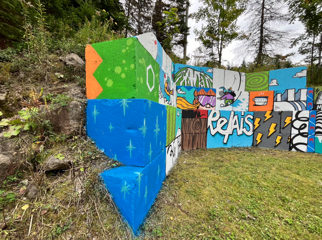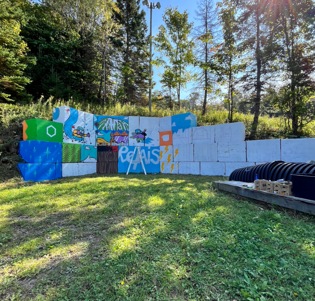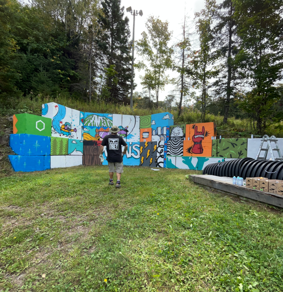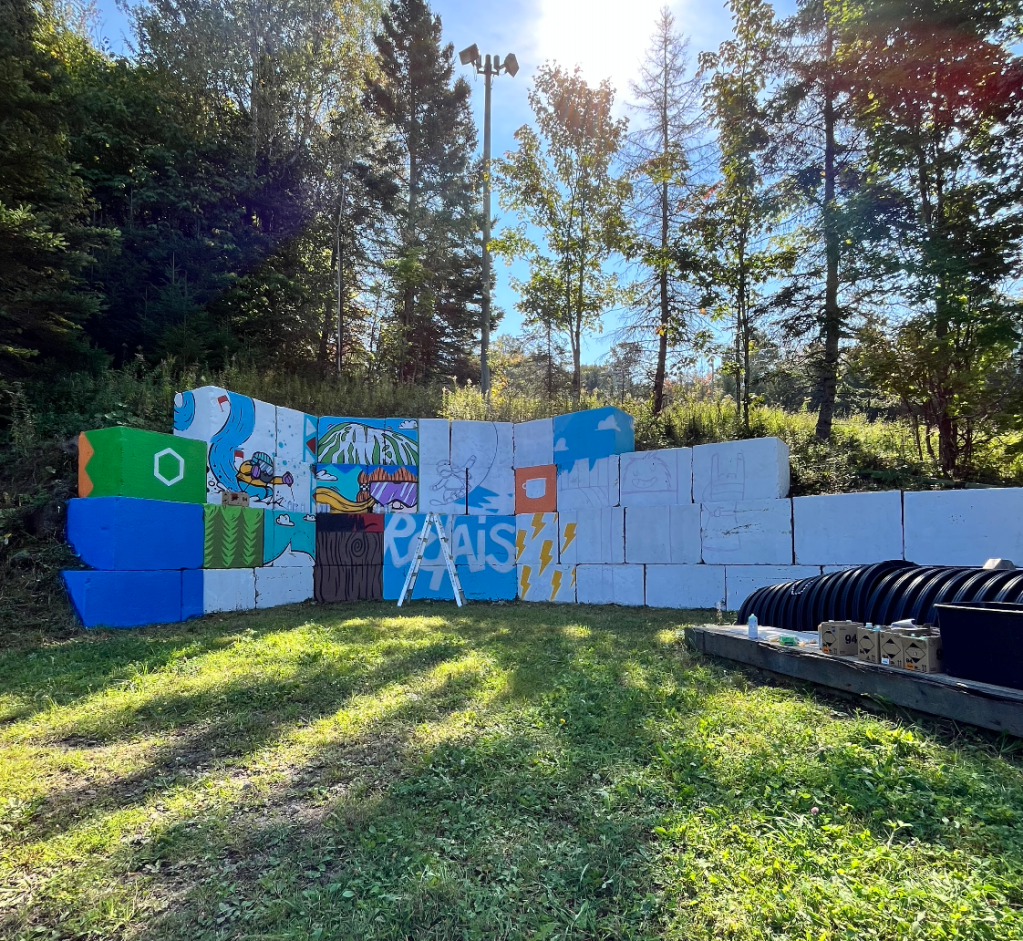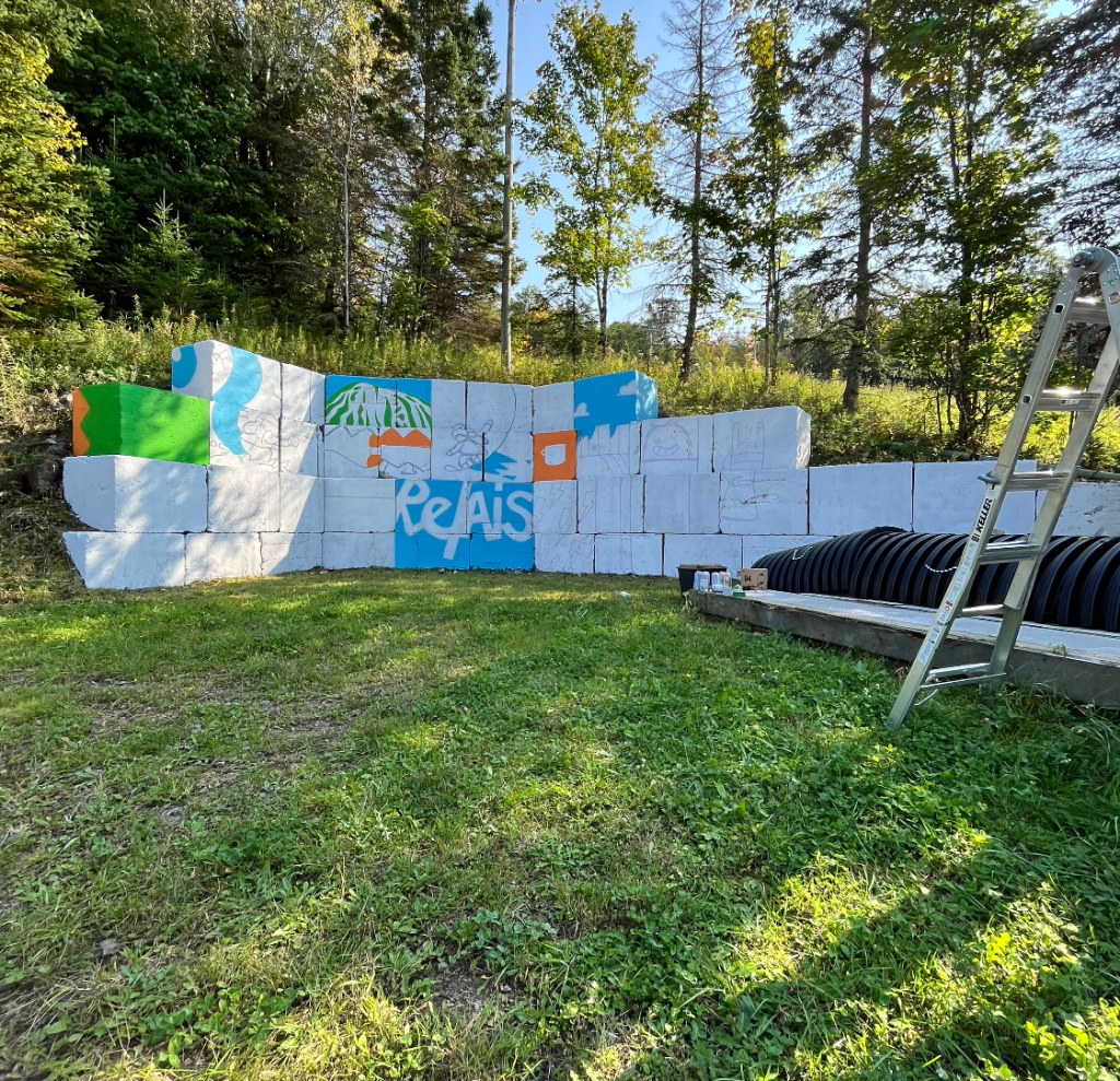 Last fall I had the pleasure to paint these huge blocks sitting at the top of the school slope in Le Relais, Lac-Beauport. The administration got tired of these gray and boring shapes and wanted them to become happier. I brainstormed around the aspects of the resort, what it provides and what kind of vibe can be found. I maintained the square aspect of the installation and made a kind of block game, similar to the cubes you used to play with as a child. It’s been a lot of fun to develop.