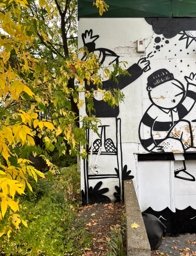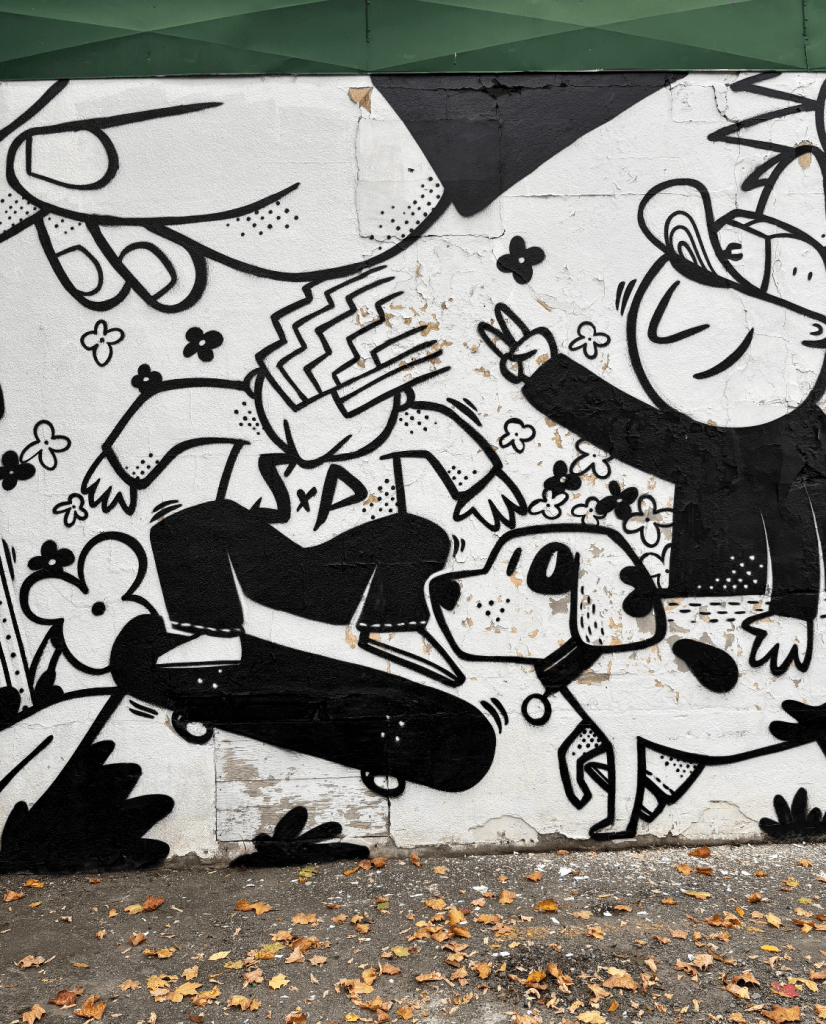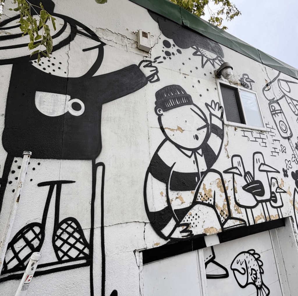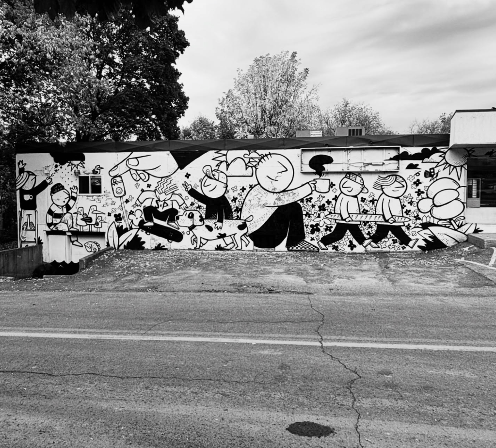 Some fine folks invited me in Ste-Dorothée, Montréal, to paint the abandoned wall next to their café. We wanted to reflect the neighborhood and put some paint on this dying wall! Here is the black and white mash up we created!